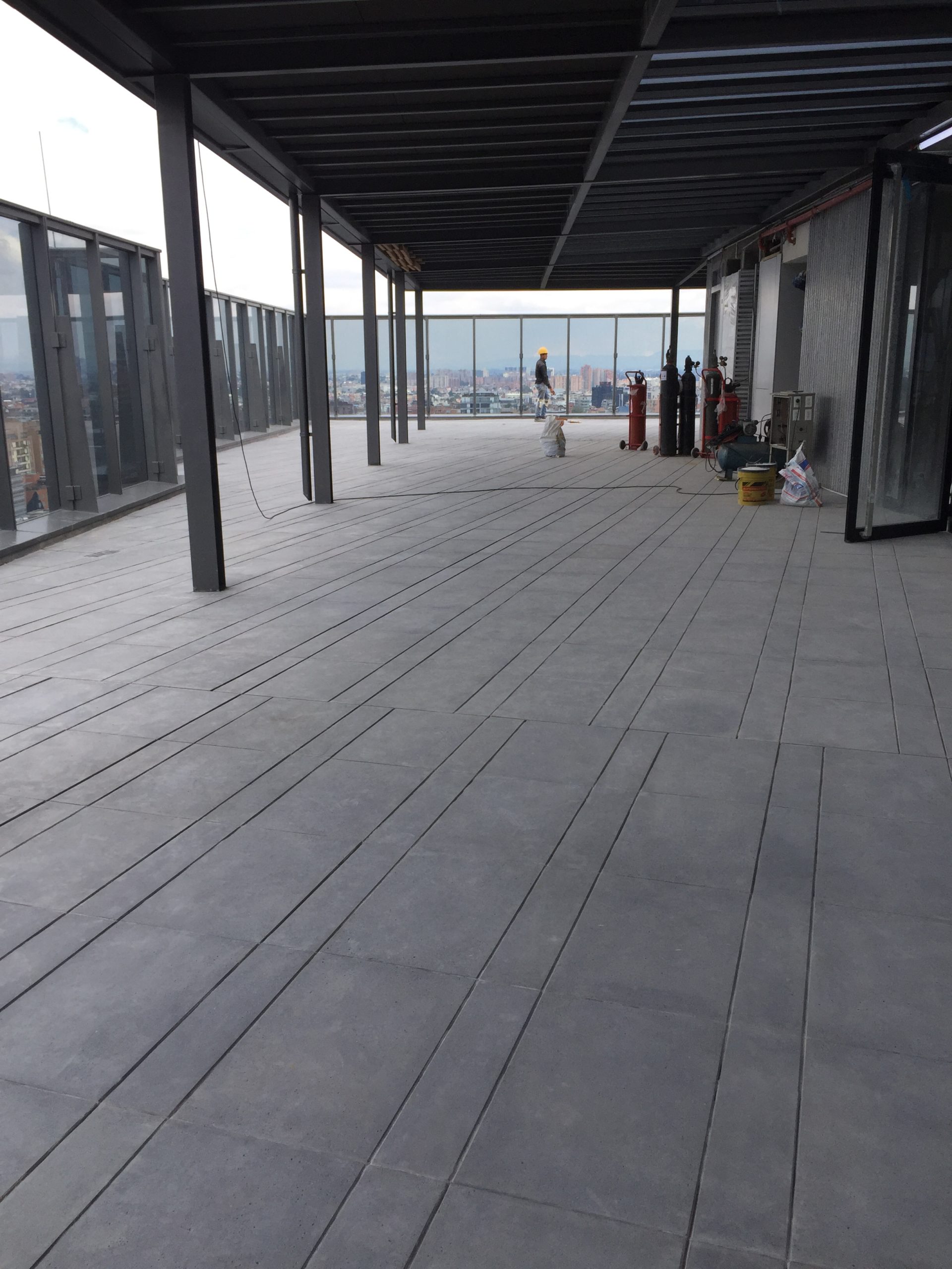 Se fabricaron dos formatos de baldosa: 60 x 40 cm y 60 x 15 cm que al usarse juntos generan un efecto tipo deck. Su color gris y el uso del concreto arquitectónico permitió hacer la transición entre los materiales de la vía pública y terraza del edificio.