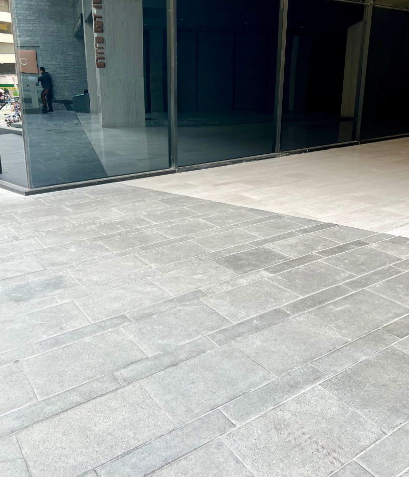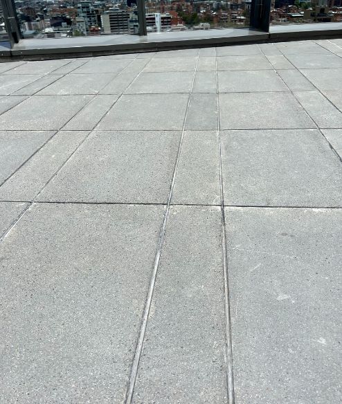 Se fabricaron dos formatos de baldosa: 60 x 40 cm y 60 x 15 cm que al usarse juntos generan un efecto tipo deck. Su color gris y el uso del concreto arquitectónico permitió hacer la transición entre los materiales de la vía pública y terraza del edificio.