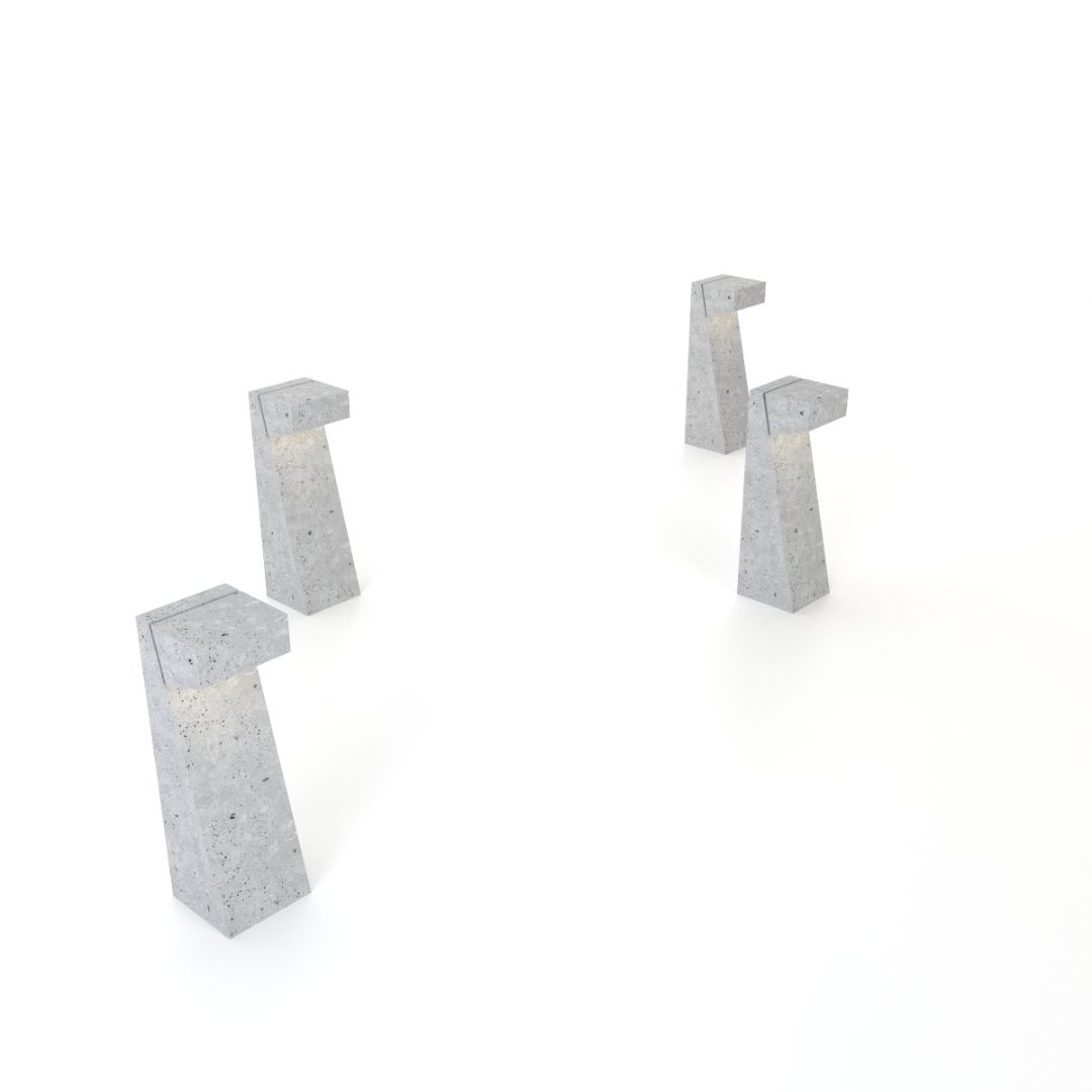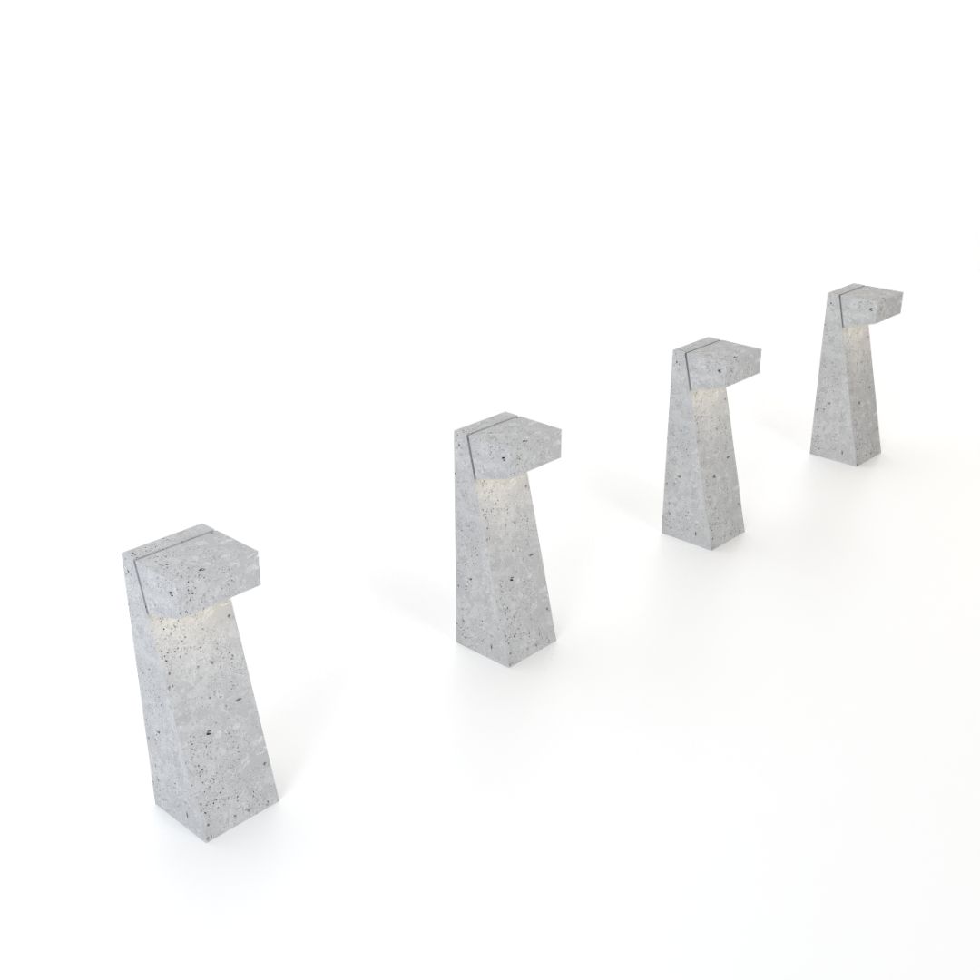 El Bolardo Ruffo es una pieza en concreto arquitectónico que integra iluminación y geometría en un solo elemento. Su diseño inclinado y su apertura superior proyectan luz de manera controlada, generando recorridos seguros y atmósferas cálidas en espacios exteriores.